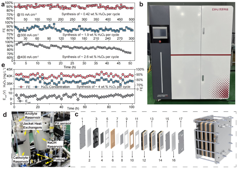 图4 | 自呼吸电极在苛刻条件下的工业验证与放大。a PPE-T在15、300和400 mA cm-2下的长期稳定性。b 完全集成的中试规模电解系统照片,包含四个串联电堆,集成了电子、流体和热管理子系统。c 四电堆模块化电堆的爆炸示意图。关键组件包括:1/17,端板;2/5/9/11/16,硅胶垫片;3,实现自呼吸和结构支撑的多功能双极板;4,自呼吸GDE;6,阴极流场板;7,质子交换膜;8,阳极;10,阳极流场板;12-14,串联电化学电堆,每个由组件3-11组装而成;16,阳极集流体。d H2O2电解平台内部流体和热管理子系统的内部视图。该平台包含由蠕动泵驱动的阳极和阴极循环回路,分别使用5 mol L-1 NaOH(阳极液,pH=14 ± 0.02)和去离子水(阴极液)。每个回路集成了流量、压力以及液位/pH监测。电解液温度通过两个储液罐中的内置水套换热器调节。模块化电源安装在单元上方(未显示)。e 放大系统的长期稳定性。电解在环境压力自呼吸条件下以100 mA cm-2运行。