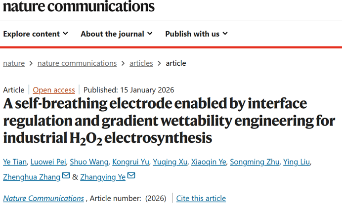 近日,浙江大学叶章颖教授和清华大学深圳国际研究生院环境与生态研究院张正华副院长课题组在《Nature Communications》上发表了题为“A Self-Breathing Electrode Enabled by Interface Regulation and Gradient Wettability Engineering for Industrial H2O2 Electrosynthesis”的研究论文。(论文DOI:10.1038/s41467-026-68436-x)