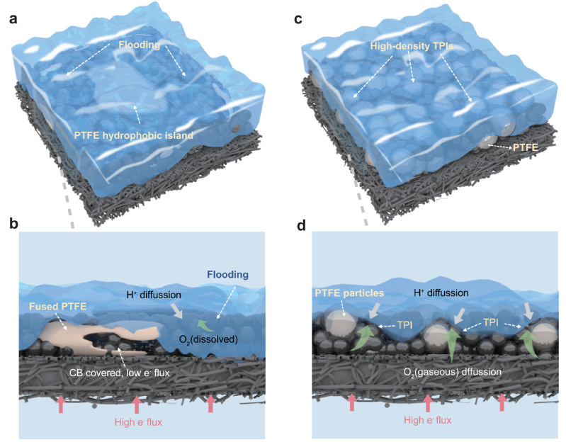 图1 | 传统与颗粒堆积型催化层(CL)结构的示意图比较及其对TPI形成的影响。a 熔融分离界面结构电极(FSE)的传统CL结构,显示大的聚四氟乙烯(PTFE)疏水岛团聚体和被电解液淹没的广阔炭黑(CB)区域。b a的放大侧视图,说明熔融PTFE域覆盖CB颗粒,而周围的CB浸没在电解液中,仅依赖溶解氧进行2e⁻ ORR,严重限制了TPI形成。c 具有非熔融颗粒堆积界面(PPE)的催化剂层,其中PTFE和CB颗粒形成多孔且交错分布的网状结构。d c的放大侧视图,离散的PTFE颗粒创造局部疏水微环境,使邻近的CB能够参与2e⁻ ORR,从而产生丰富且均匀分布的TPI。
