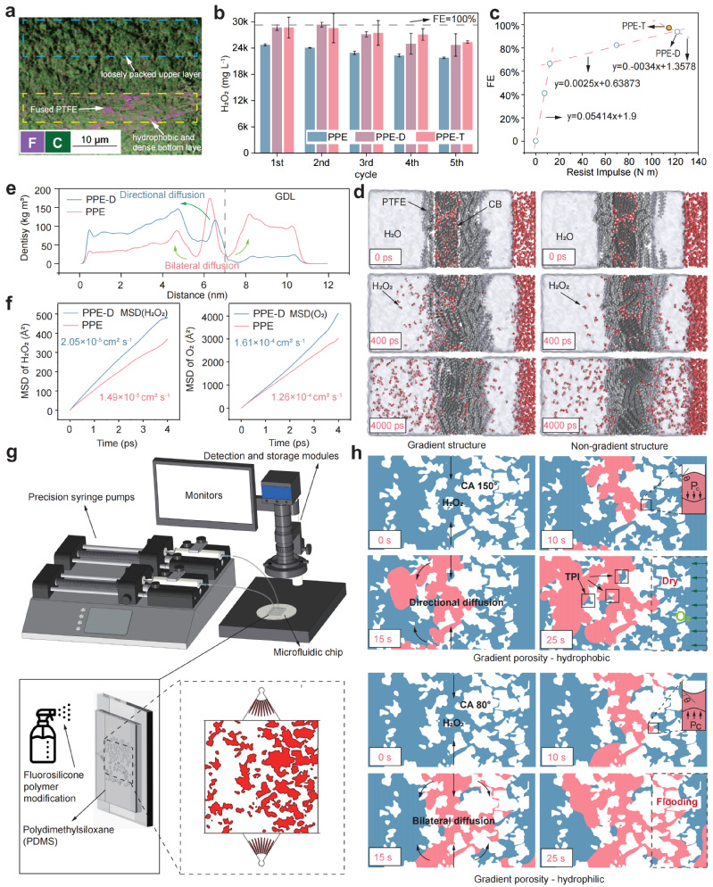 图3 | 梯度润湿性与分级孔隙结构促进定向传输并提升电极性能。a 具有致密疏水底层和颗粒堆积表层的PPE-D电极的横截面EDS映射结果,形成结构和润湿性梯度。b 不同GDE的H2O2产率和相应法拉第效率。c FE与阻力冲量(RI)之间的相关性。d 梯度与非梯度CL内H2O2扩散轨迹的分子动力学渲染。e H2O2分子的时间分辨空间密度分布,显示在梯度结构中优先向大孔和低PTFE含量区域迁移。f 梯度与非梯度CL中H2O2和O₂分子的均方位移(MSD),表明在润湿性梯度存在下增强了定向传输。g 为可视化仿生CL通道中定向H2O2流动而设计的微流控装置示意图。h 具有疏水和亲水梯度的微流控芯片中H2O2传输的实验可视化。H2O2溶液(与草酸钛钾混合)呈粉红色,从中心区域注入。孔隙显示为蓝色,固体骨架为白色。观察到的毛细驱动定向传输与CL梯度设计一致。
