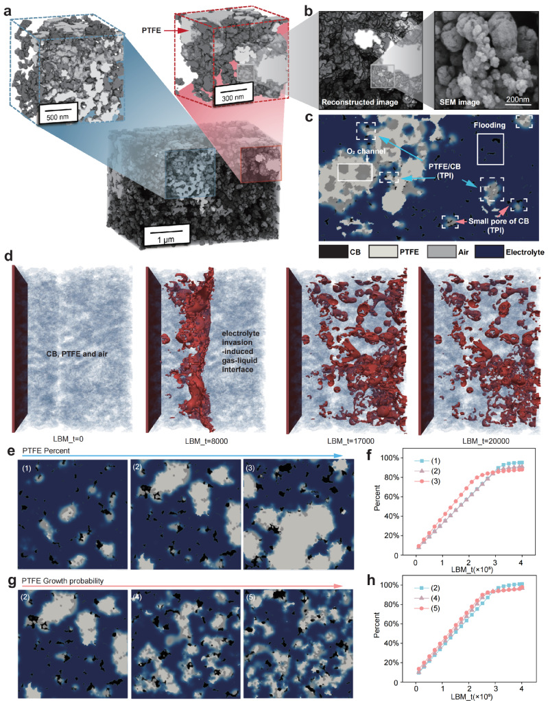 图2 | 催化剂层的三维重构揭示气液传输动力学与TPI形成。a 通过FIB-SEM重构的催化剂层(CL)真实三维结构,显示CB和PTFE的空间分布。b CL的放大局部视图,CB颗粒附着于聚集的PTFE域;提供相应的SEM图像以供比较。c 通过LBM模拟捕获的电解液侵入过程中的气-液-固分布。d CL内部气-液界面随时间的演化,突出电解液逐步渗透过程中的气泡形成与分布。e 针对PTFE含量递增(记为结构1-3)的催化剂层结构,由LBM模拟获得的气-液-固分布。f e中所示催化剂层相应的液体饱和度,说明随着PTFE含量增加,电解液侵入减少。g 针对PTFE含量相同但PTFE分散均匀度不同(记为结构2、4和5,其中PTFE的空间分布逐渐变得更加均匀)的催化剂层结构,由LBM模拟获得的气-液-固分布。h g中所示催化剂层相应的液体饱和度。